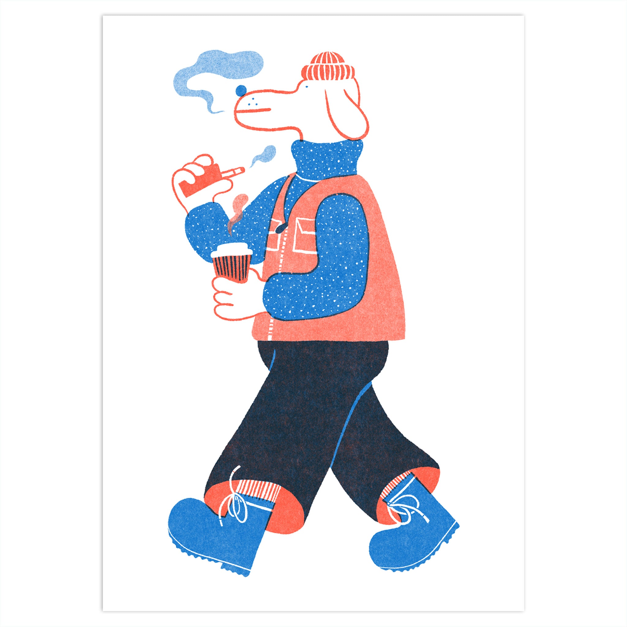 A strolling dog on their way to their next appointment having a nice hot drink and a little vape at the same time.