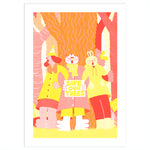 Riso art print of a group of friends in the forest protesting to protect their favourite tree. They're holding a placard that says "save our trees". They're also having a bit of a sing song to keep their spirits up.