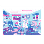 A snapshot of a busy risograph print club. They're making a fun little zine featuring hard-hitting articles such as "Fish Dreams Explained" and "Top Five Hats For Cats".