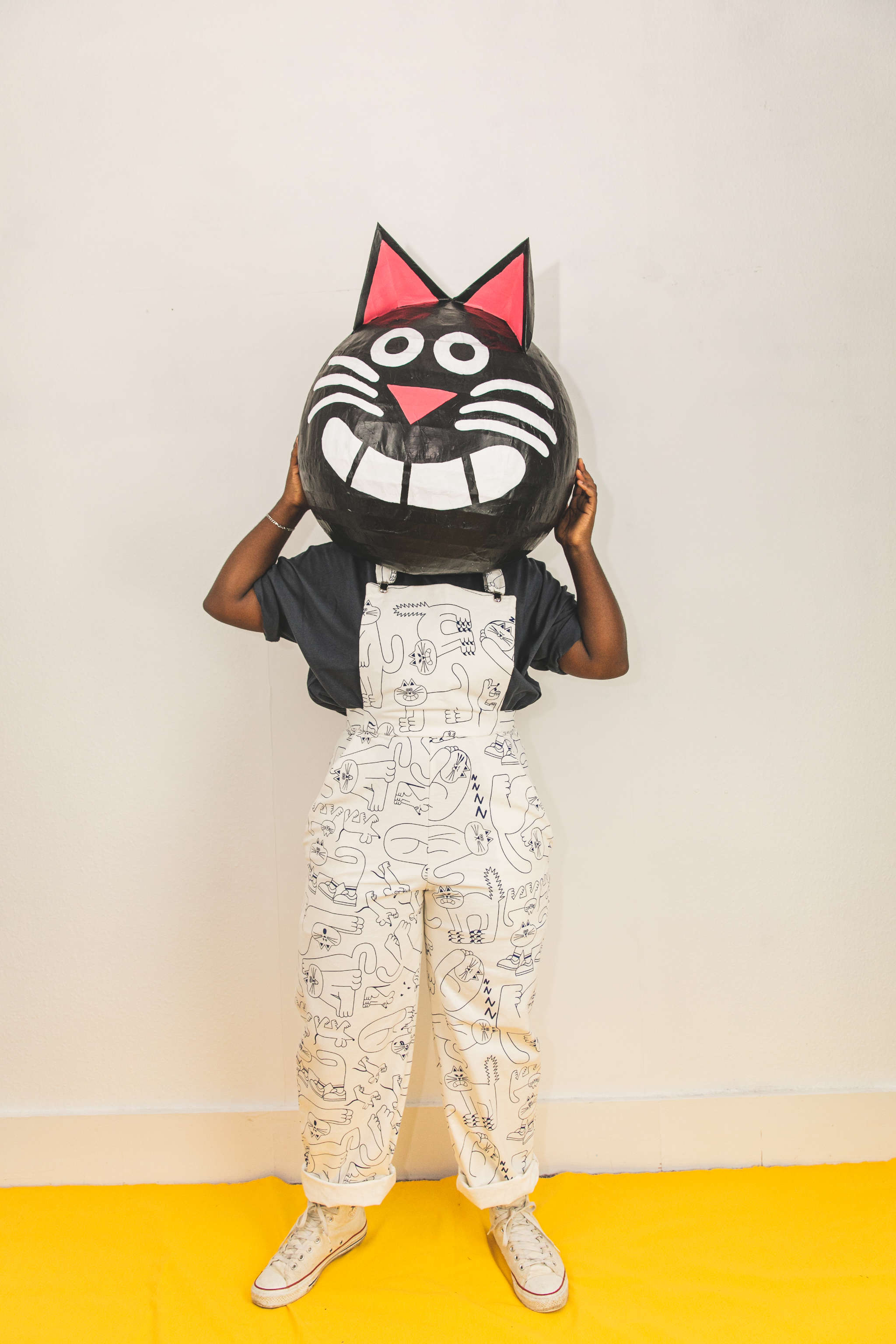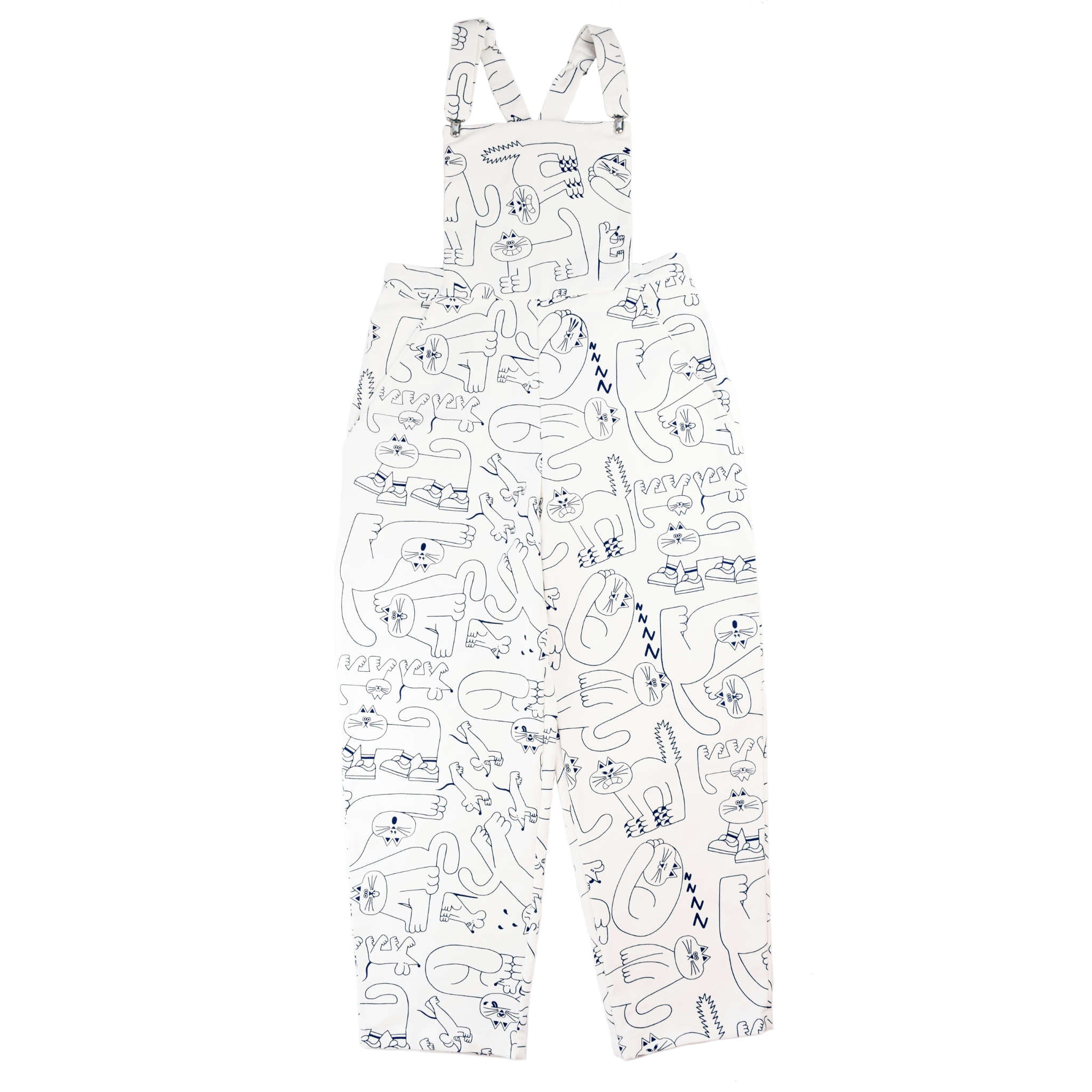 Looking for organic cotton dungarees with a cat print? Yes you are! These mega dungarees are a crisp classic white printed with navy blue ink. White on black colour way option is also available!
