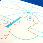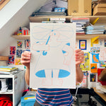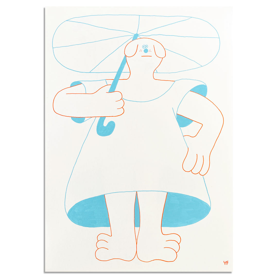 Original drawing of a YUK FUN character posing with their parasol. Drawn with posca pens in blue and orange.