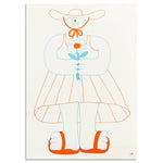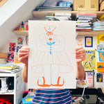 Original drawing of a charming YUK FUN character holding a big flower. Drawn with posca pens in blue and orange.