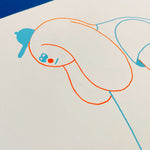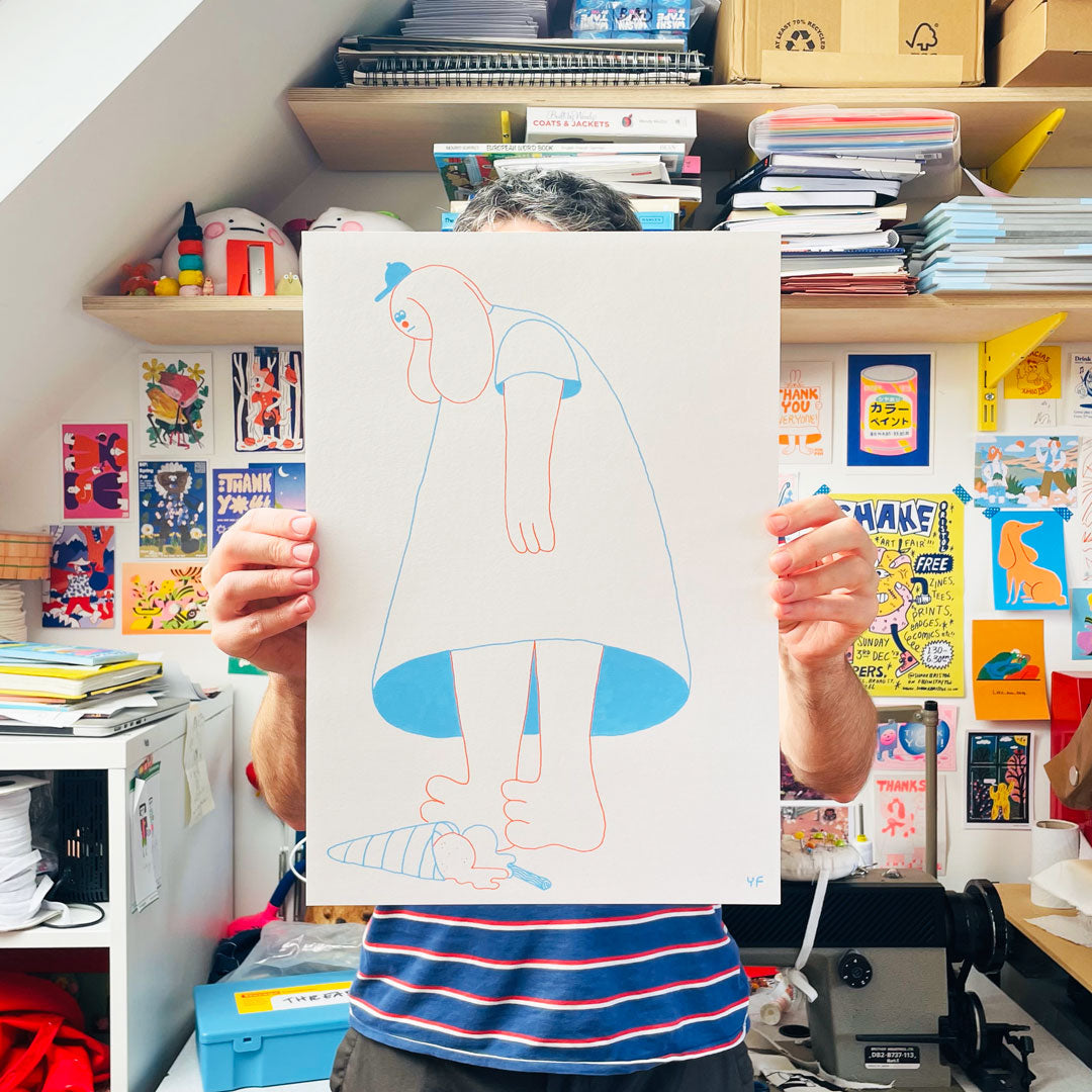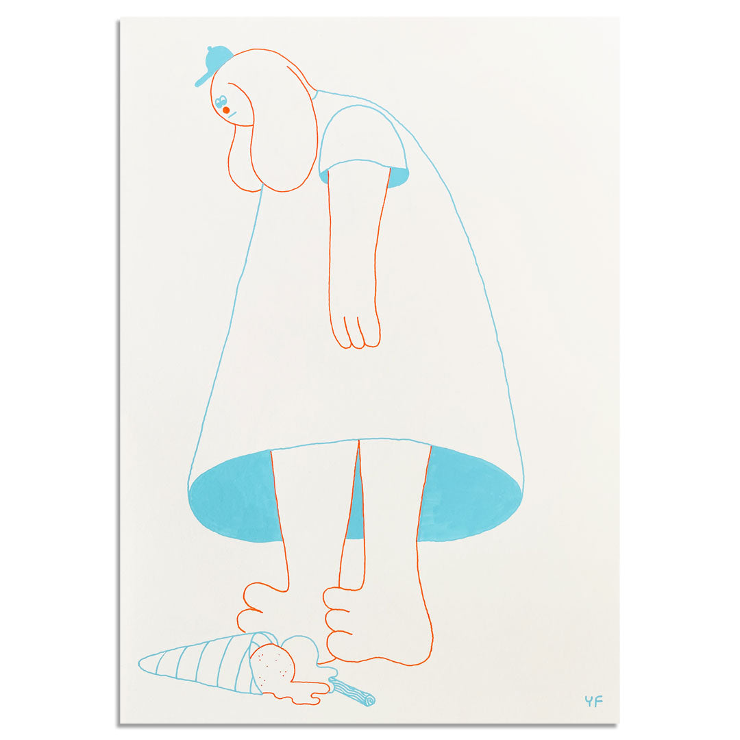 Original drawing of a devastated YUK FUN character looking down at their ice cream on the floor. Drawn with posca pens in blue and orange.