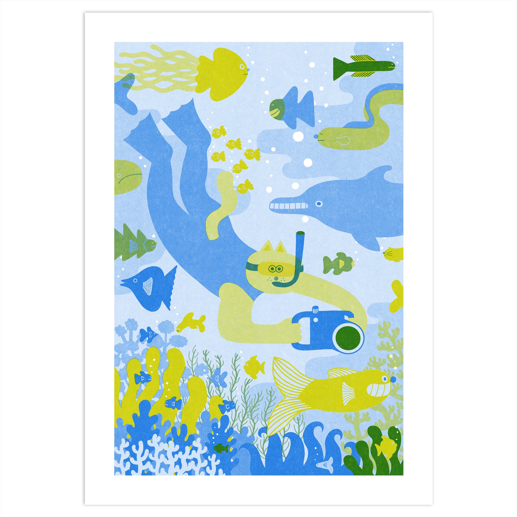 Riso art print of an animal marine biologist taking some underwater photos for their research. Some of those fish are pretty happy to have their photo taken.