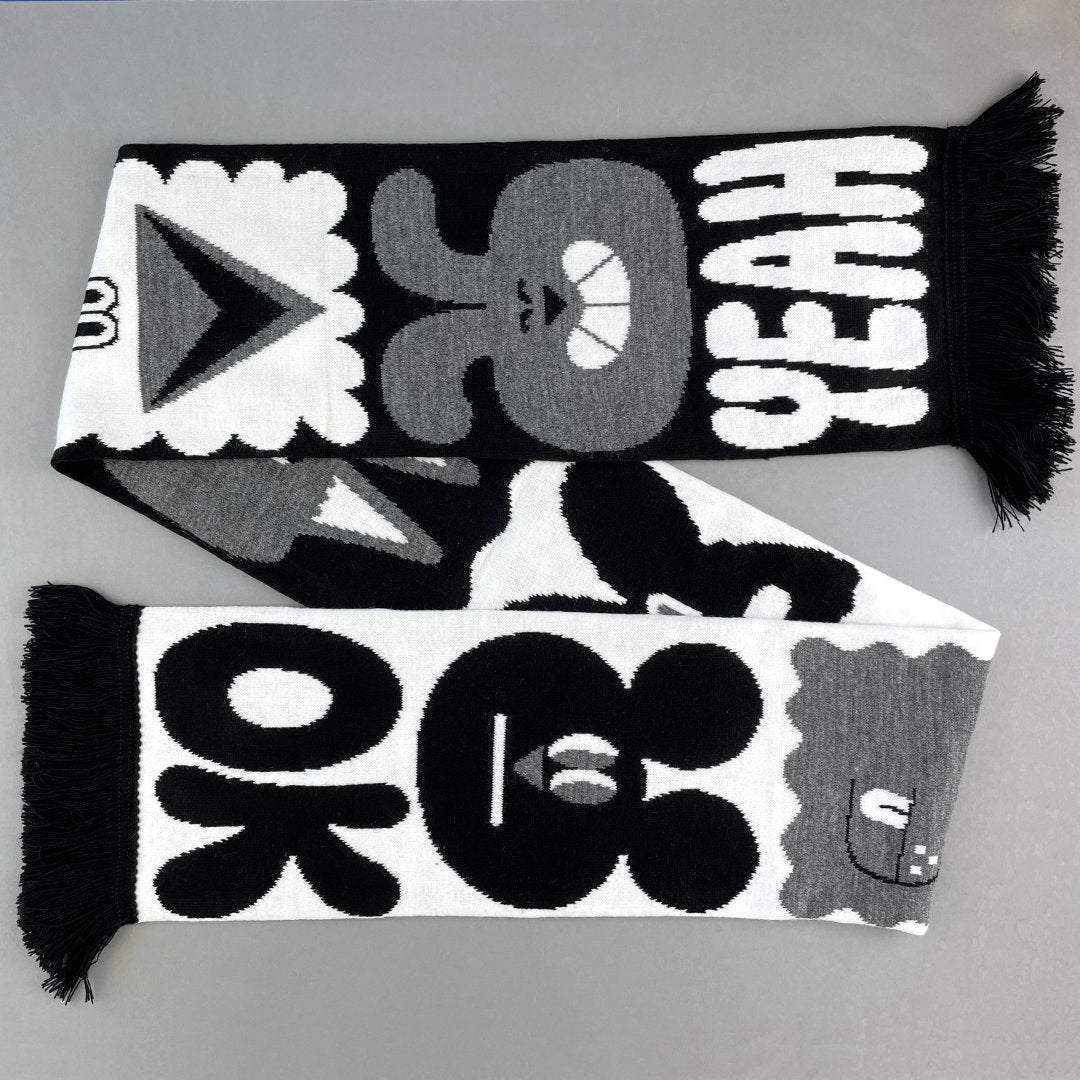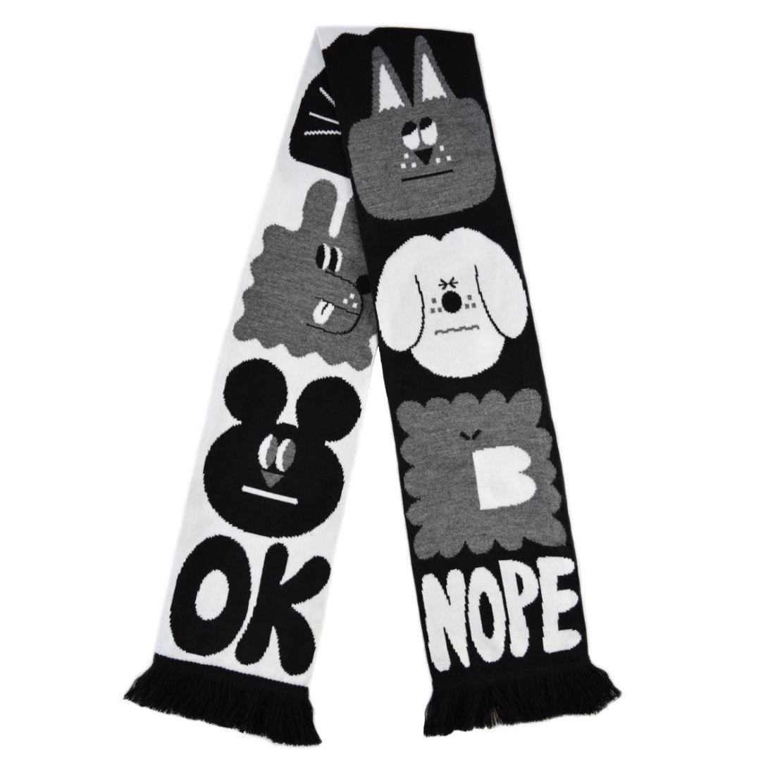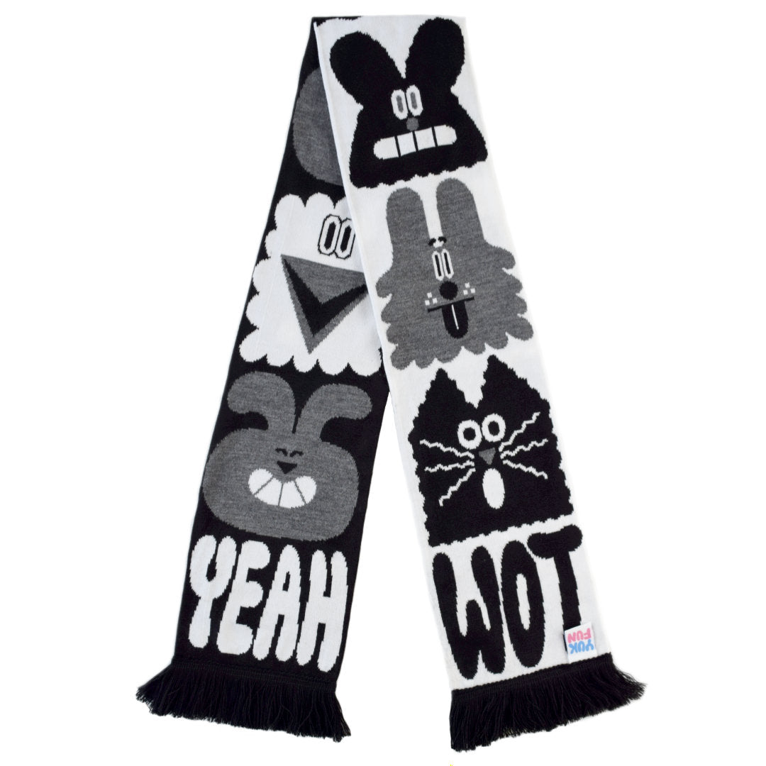 A black and white knitted scarf for all your conversational needs! Our Chit Chat scarf has all the words you need including: OK, Yeah, Wot and Nope on each end. Also includes 12 different animal faces, useful for showing your deepest darkest feelings.