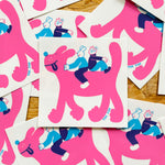 Just two pals riding their giant pink dog sticker made from eco friendly vinyl.