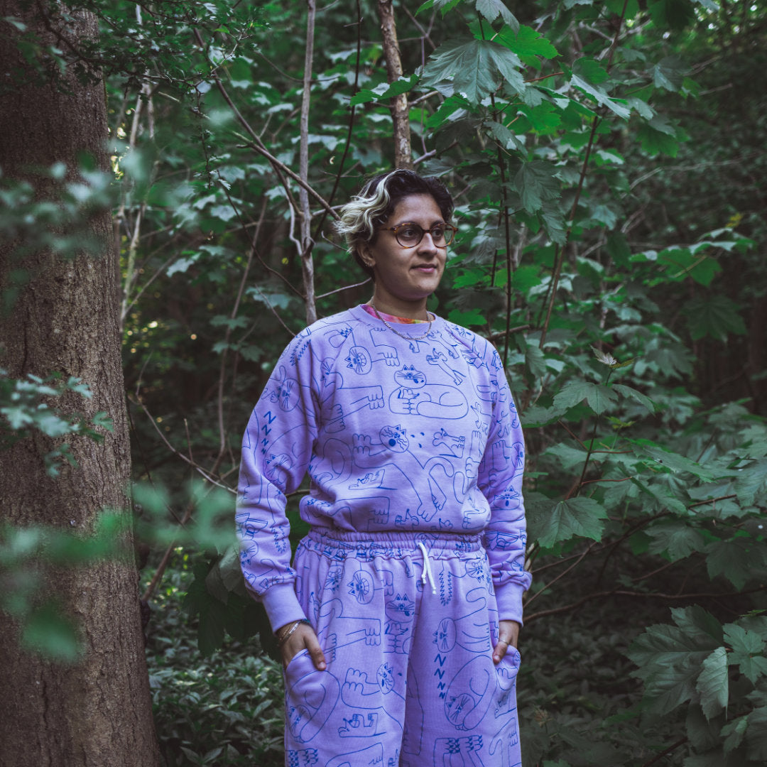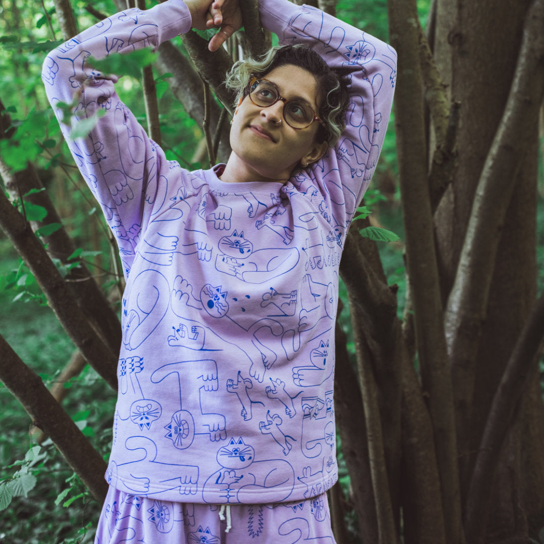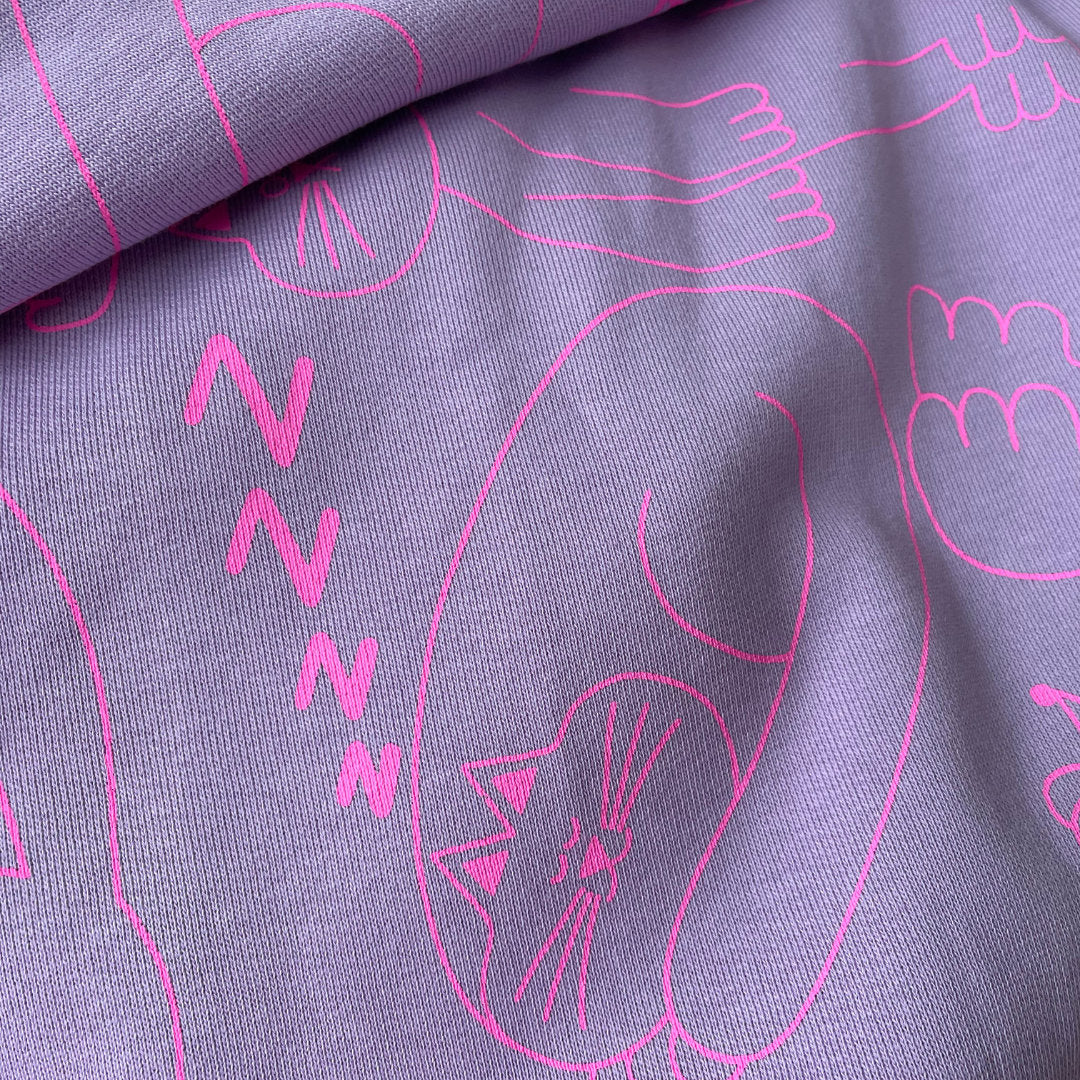 Finally an all over print sweatshirt! A raglan sweatshirt covered in little Doras doing this and that (also chasing a rat friend or two...) in a dreamy lilac colour with either blue or neon pink print. If you didn't know already, Dora is our cat boss who lives in our house (^◔ᴥ◔^) meow!