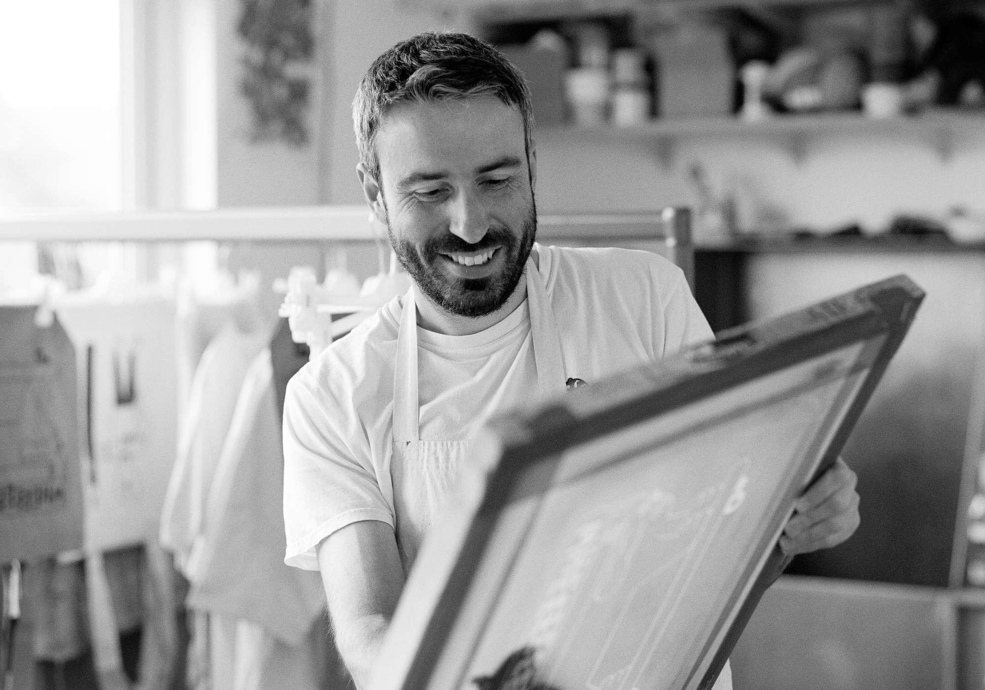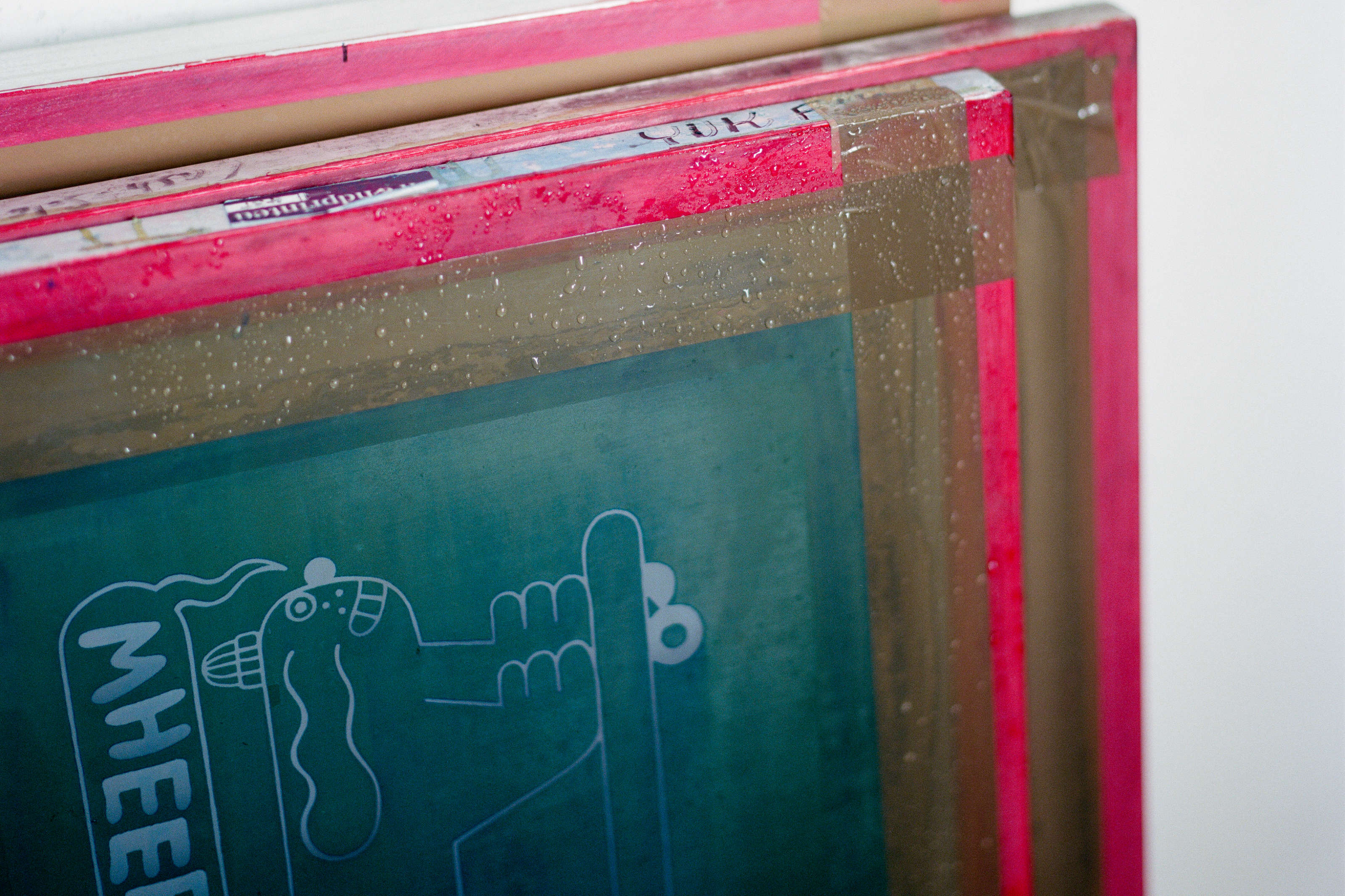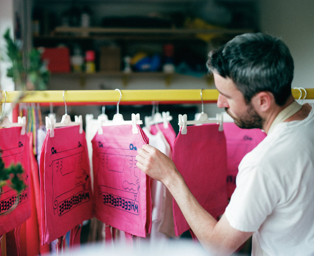 We currently work from our home studio in Portslade-by-Sea on the south coast of England, screen printing, making clothes and drawing.