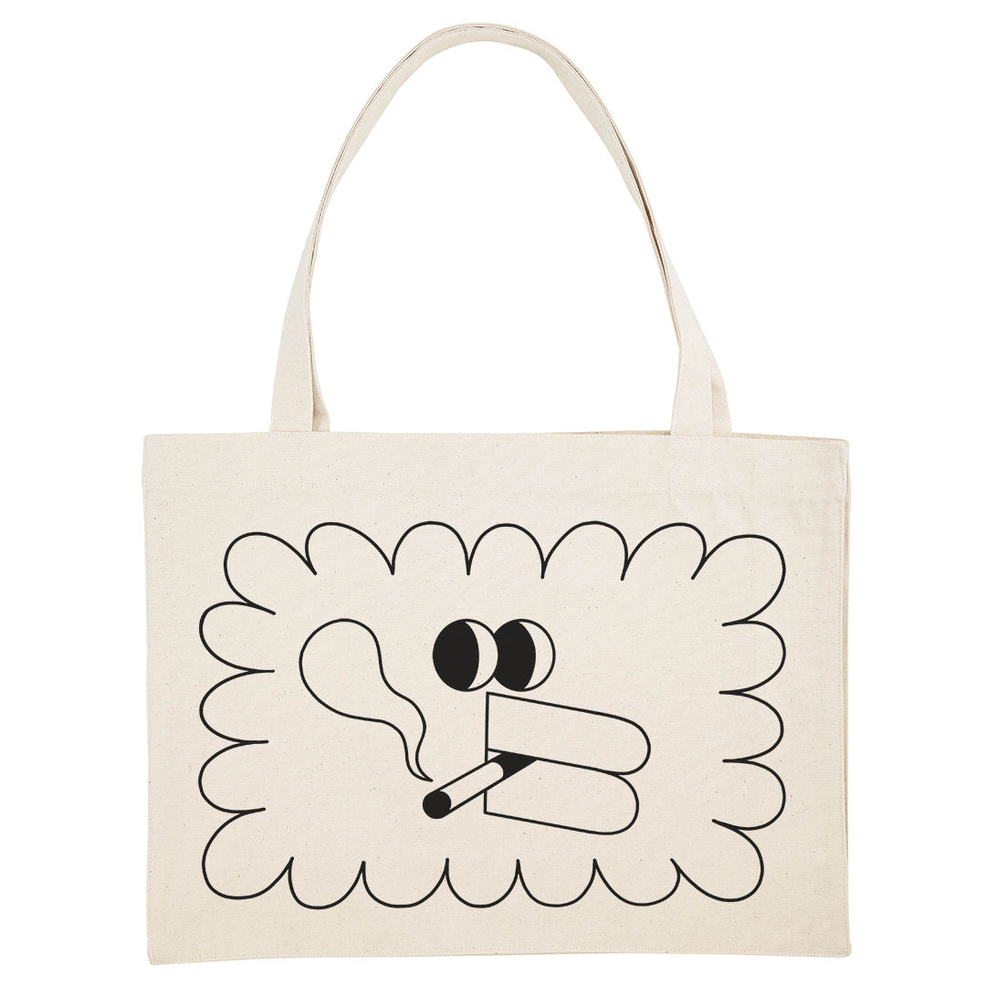 Oversized shopping bag with a bird having a smoke printed on it.