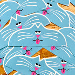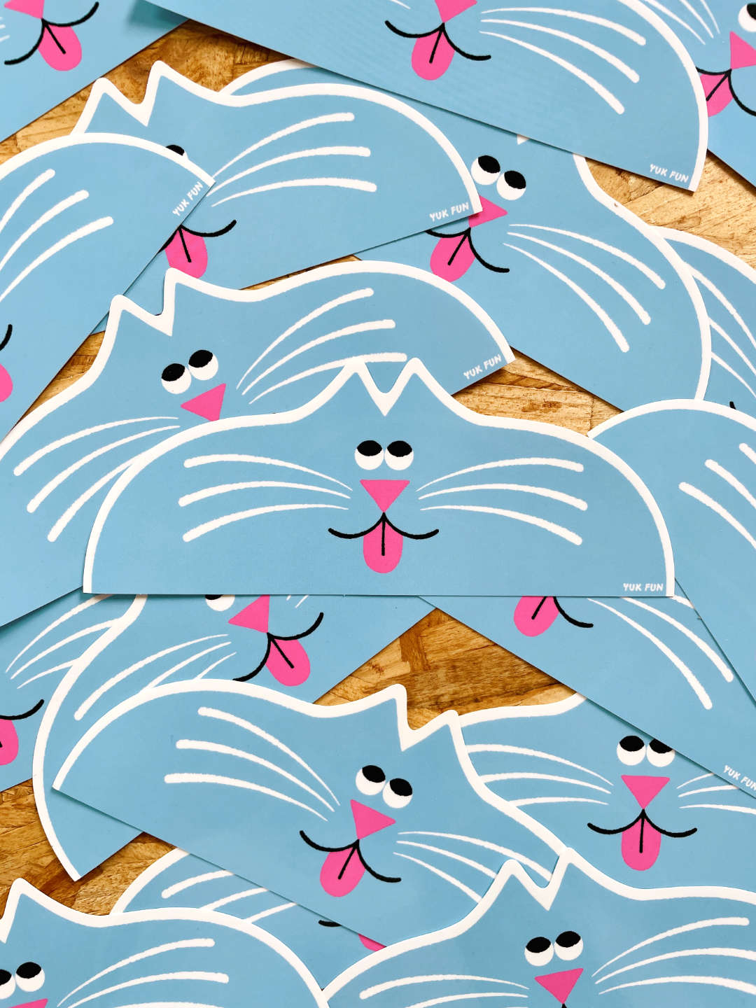 This is a sizable big blue cat face glossy sticker made from eco friendly vinyl, but what is it looking at? You decide!